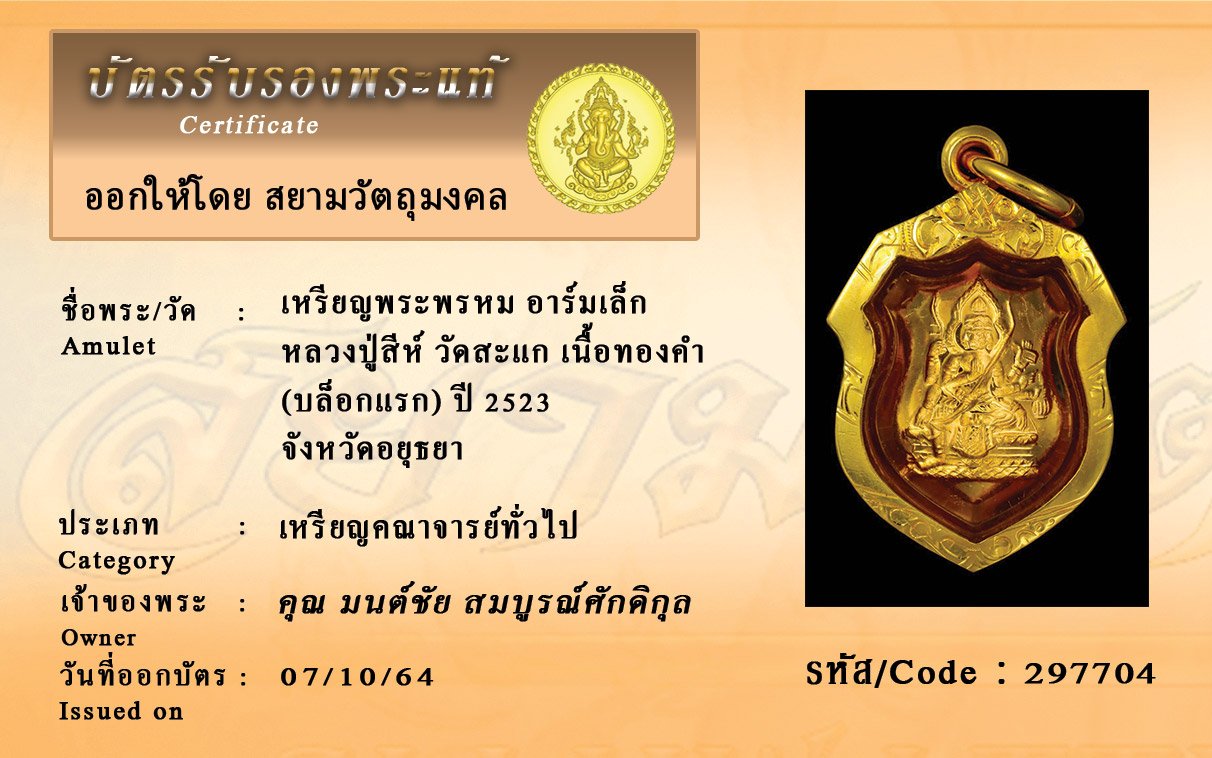 รหัสสินค้า : 297704 เหรียญพระพรหม อาร์มเล็ก หลวงปู่สีห์ วัดสะแก เนื้อทองคำ (บล็อกแรก) ปี 2523 จังหวัดอยุธยา