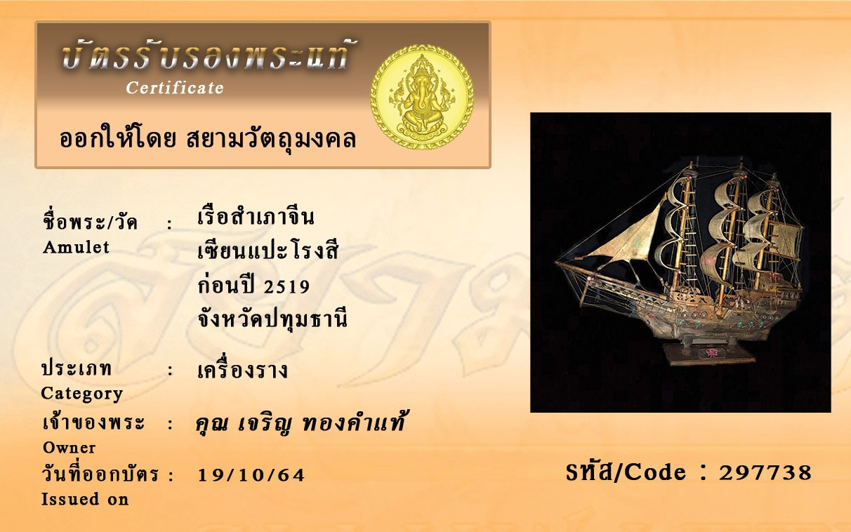 รหัสสินค้า : 297738 เรือสำเภาจีน เซียนแปะโรงสี ก่อนปี 2519 จังหวัดปทุมธานี