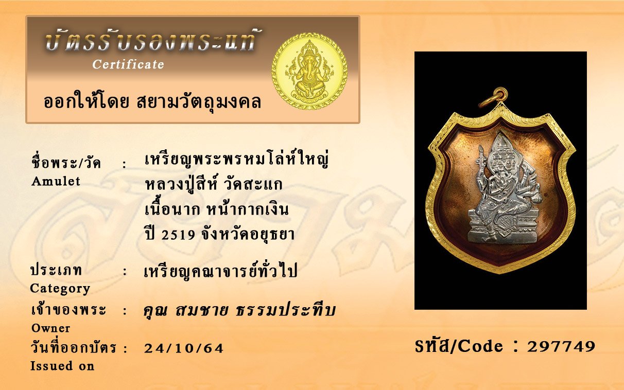 รหัสสินค้า : 297749 เหรียญพระพรหมโล่ห์ใหญ่ หลวงปู่สีห์ วัดสะแก เนื้อนาก หน้ากากเงิน ปี 2519 จังหวัดอยุธยา