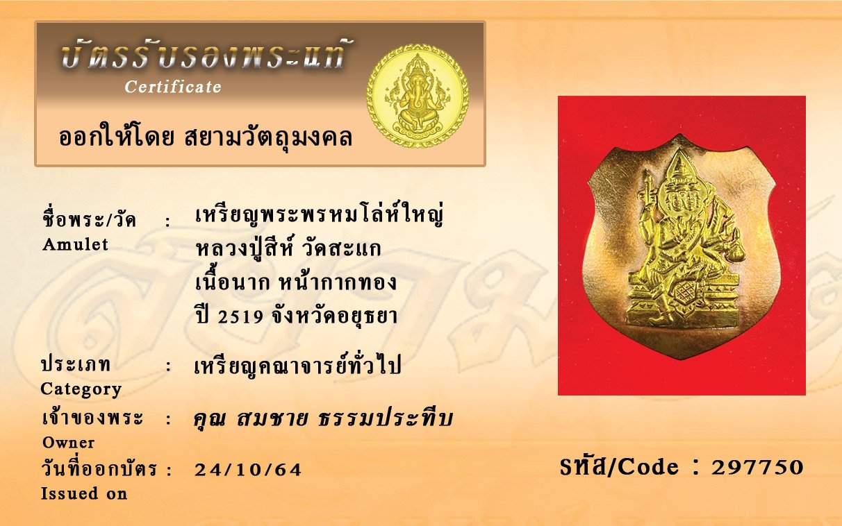 รหัสสินค้า : 297750 เหรียญพระพรหมโล่ห์ใหญ่ หลวงปู่สีห์ วัดสะแก เนื้อนาก หน้ากากทอง ปี 2519 จังหวัดอยุธยา