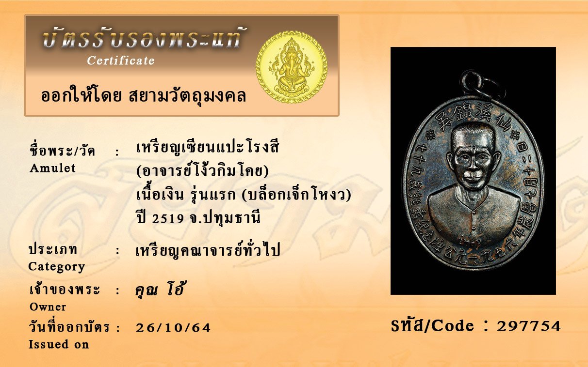 รหัสสินค้า : 297754 เหรียญเซียนแปะโรงสี (อาจารย์โง้วกิมโคย) เนื้อเงิน รุ่นแรก (บล็อกเจ็กโหงว) ปี 2519 จ.ปทุมธานี