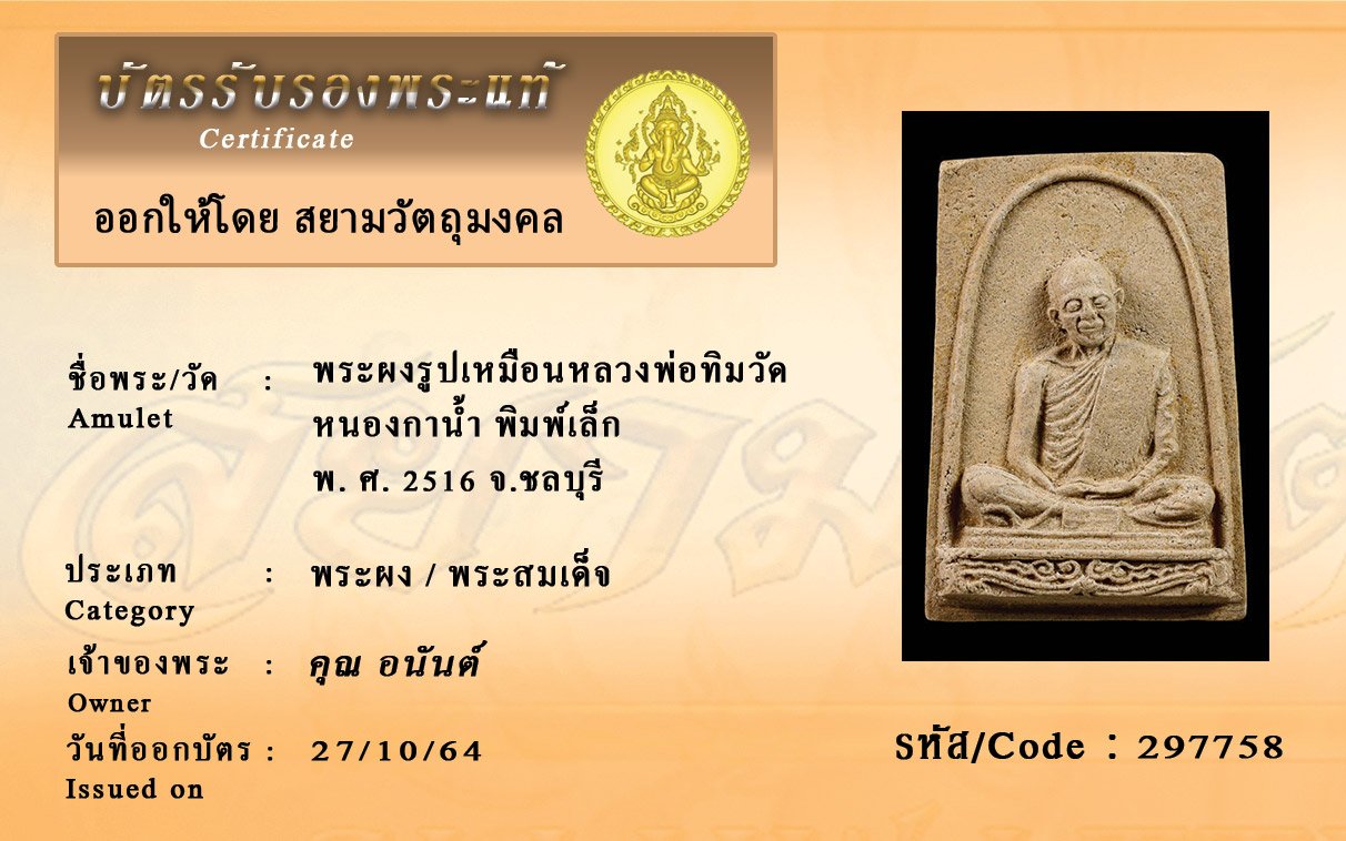 รหัสสินค้า : 297758 พระผงรูปเหมือนหลวงพ่อทิมวัด หนองกาน้ำ พิมพ์เล็ก พ. ศ. 2516 จ.ชลบุรี