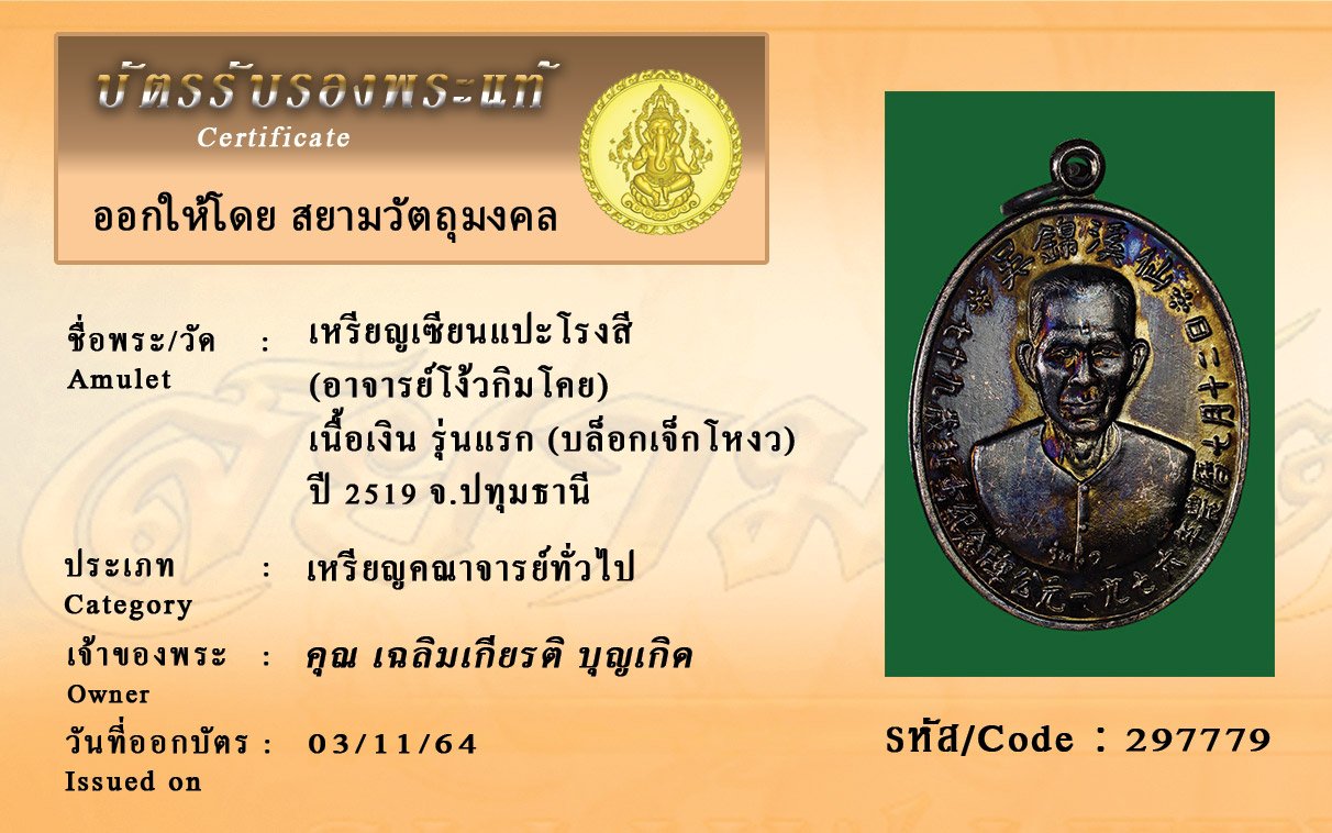 รหัสสินค้า : 297779 เหรียญเซียนแปะโรงสี (อาจารย์โง้วกิมโคย) เนื้อเงิน รุ่นแรก (บล็อกเจ็กโหงว) ปี 2519 จ.ปทุมธานี