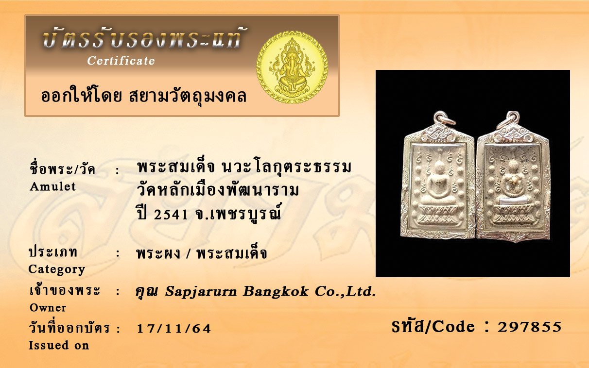 รหัสสินค้า : 297855 พระสมเด็จ นวะโลกุตระธรรม วัดหลักเมืองพัฒนาราม ปี 2541 จ.เพชรบูรณ์