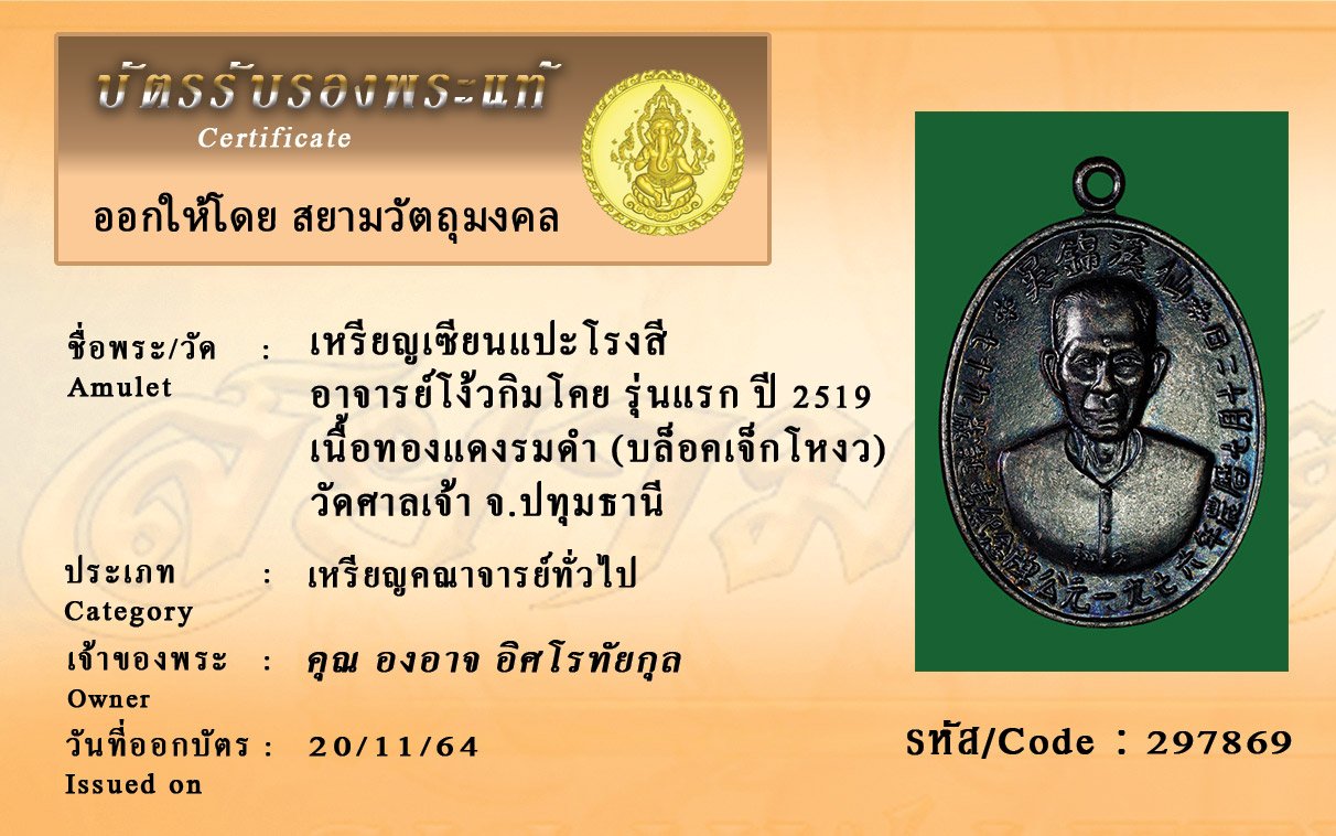 รหัสสินค้า : 297869 เหรียญเซียนแปะโรงสี อาจารย์โง้วกิมโคย รุ่นแรก ปี 2519 เนื้อทองแดงรมดำ (บล็อคเจ็กโหงว) วัดศาลเจ้า จ.ปทุมธานี