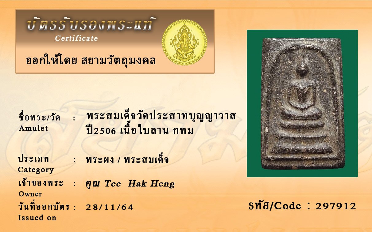 รหัสสินค้า : 297912 พระสมเด็จวัดประสาทบุญญาวาส ปี2506 เนื้อใบลาน กทม
