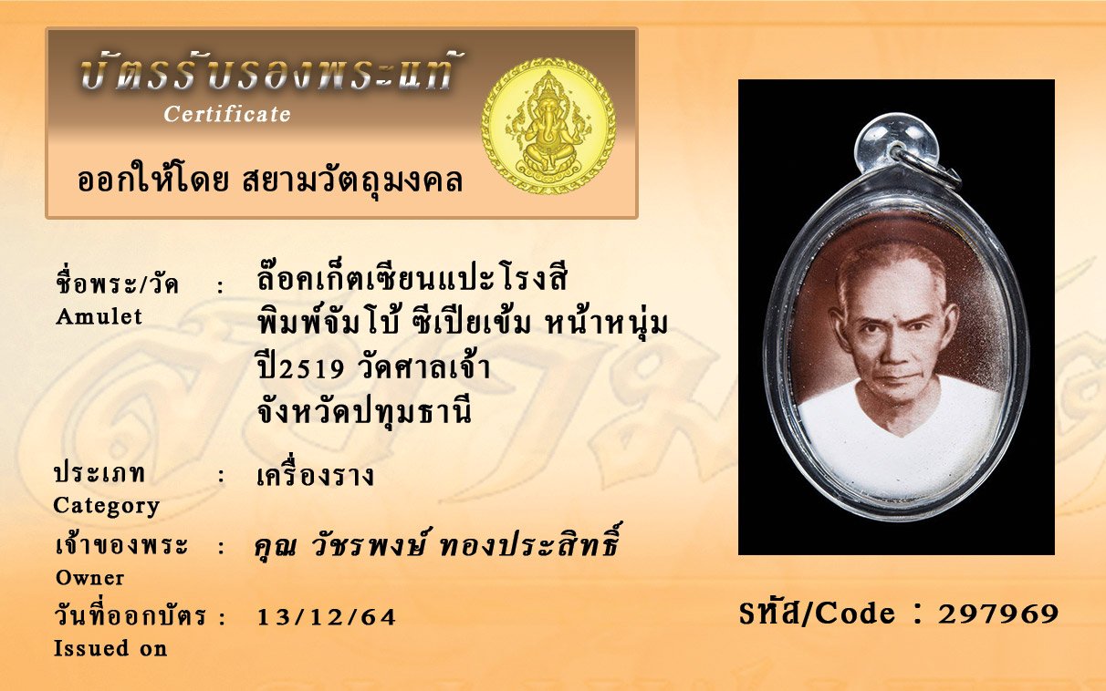 รหัสสินค้า : 297969 ล๊อคเก็ตเซียนแปะโรงสี พิมพ์จัมโบ้ ซีเปียเข้ม หน้าหนุ่ม ปี2519 วัดศาลเจ้า จังหวัดปทุมธานี