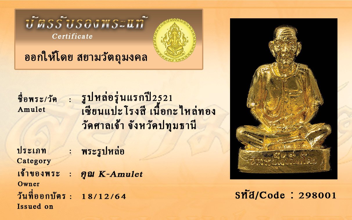 รหัสสินค้า : 298001 รูปหล่อรุ่นแรกปี2521 เซียนแปะโรงสี เนื้อกะไหล่ทอง วัดศาลเจ้า จังหวัดปทุมธานี