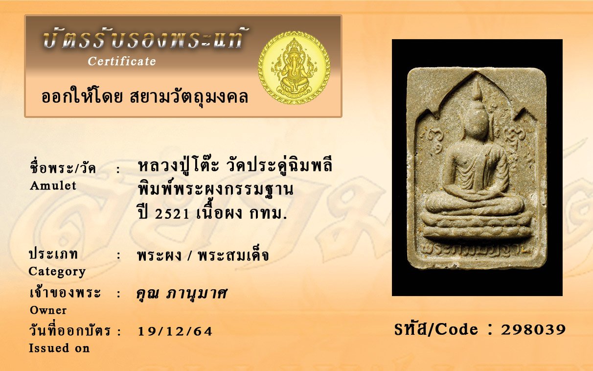 รหัสสินค้า : 298039 หลวงปู่โต๊ะ วัดประดู่ฉิมพลี พิมพ์พระผงกรรมฐาน ปี 2521 เนื้อผง กทม. ชื่อเจ้าของบัตร ภานุมาศ