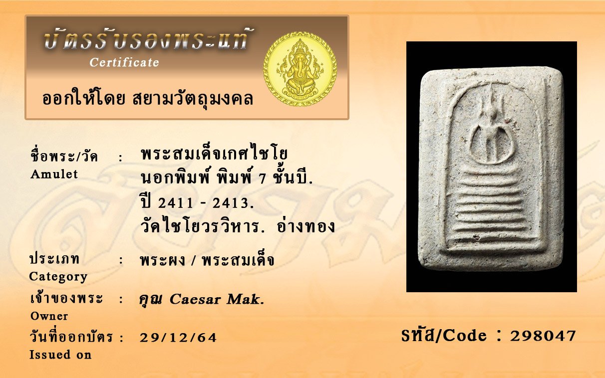 รหัสสินค้า : 298047 พระสมเด็จเกศไชโย นอกพิมพ์ พิมพ์ 7 ชั้นบี. ปี 2411 - 2413. วัดไชโยวรวิหาร. อ่างทอง
