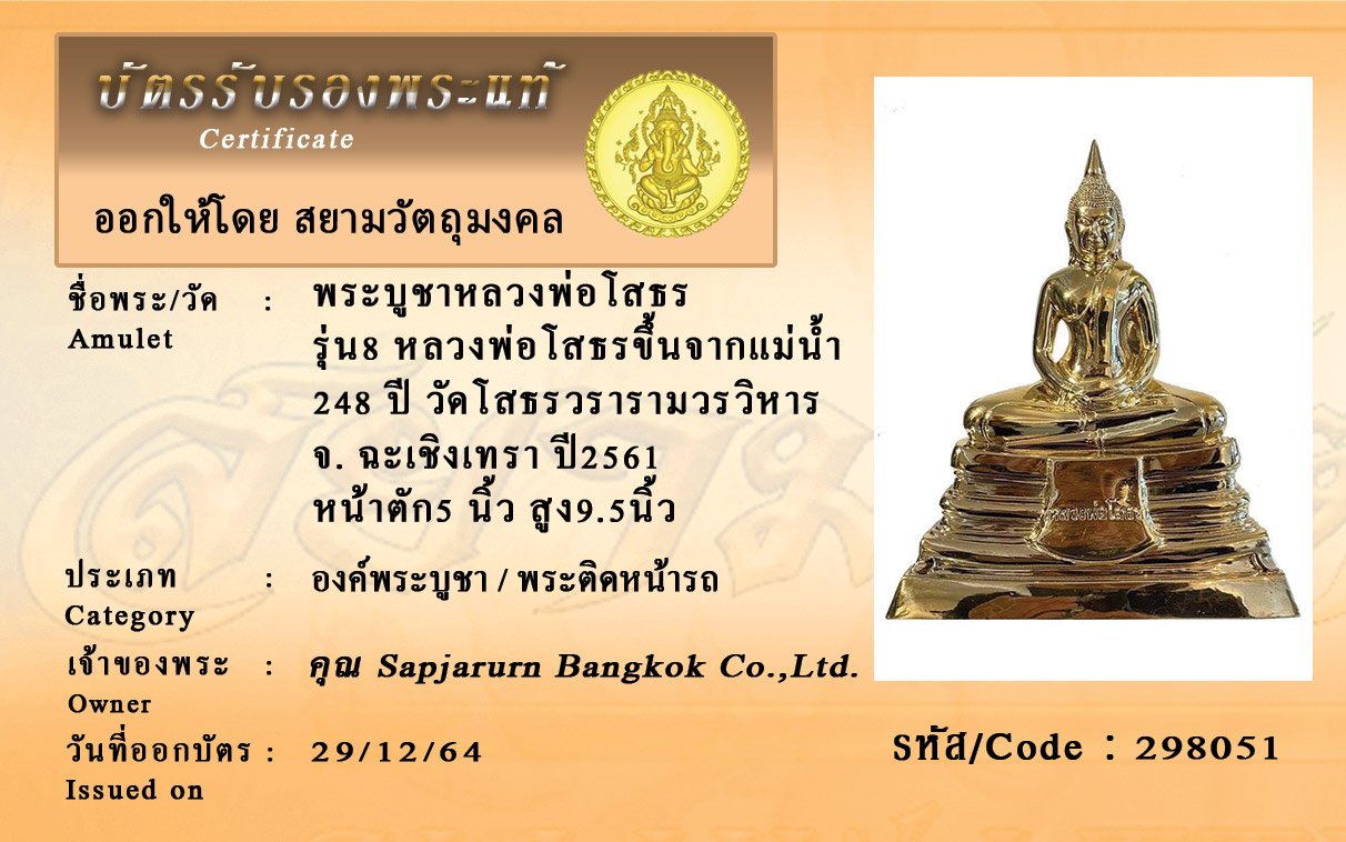 รหัสสินค้า : 298051 พระบูชาหลวงพ่อโสธร รุ่น8 หลวงพ่อโสธรขึ้นจากแม่น้ำ 248 ปี วัดโสธรวรารามวรวิหาร จ. ฉะเชิงเทรา ปี2561 หน้าตัก5 นิ้ว สูง9.5นิ้ว