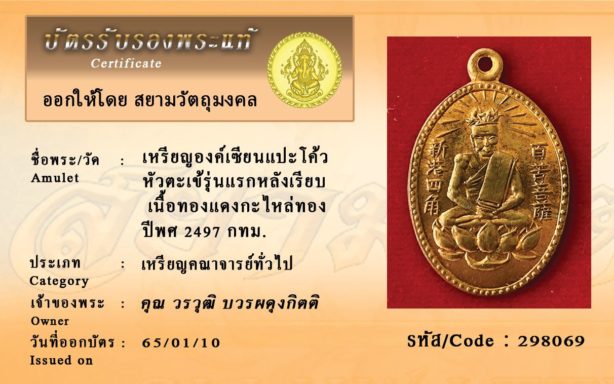 รหัสสินค้า : 298069 เหรียญองค์เซียนแปะโค้ว หัวตะเข้รุ่นแรกหลังเรียบ เนื้อทองแดงกะไหล่ทอง ปีพศ 2497 กทม.