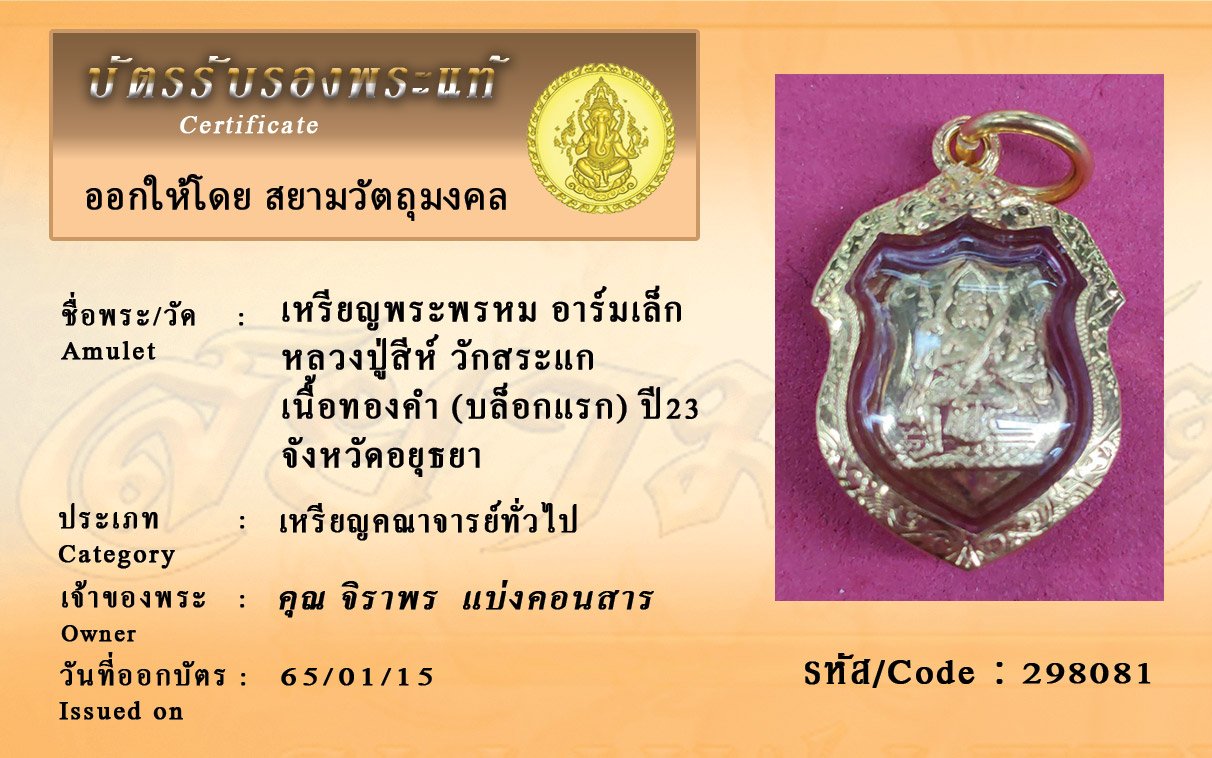 รหัสสินค้า : 298081 เหรียญพระพรหม อาร์มเล็ก หลวงปู่สีห์ วักสระแก เนื้อทองคำ (บล็อกแรก) ปี23 จังหวัดอยุธยา