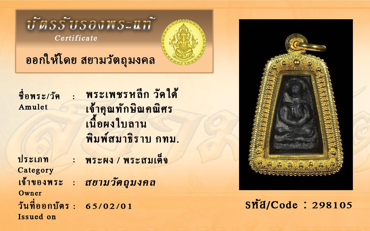 รหัสสินค้า : 298105 พระเพชรหลีก วัดใต้ เจ้าคุณทักษิณคณิศร เนื้อผงใบลาน พิมพ์สมาธิราบ กทม.