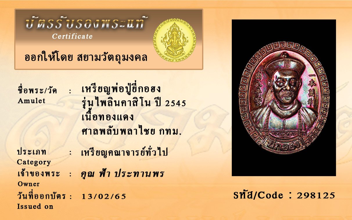 รหัสสินค้า : 298125 เหรียญพ่อปู่ยี่กอฮง รุ่นไพลินคาสิโน ปี 2545 เนื้อทองแดง ศาลพลับพลาไชย กทม.