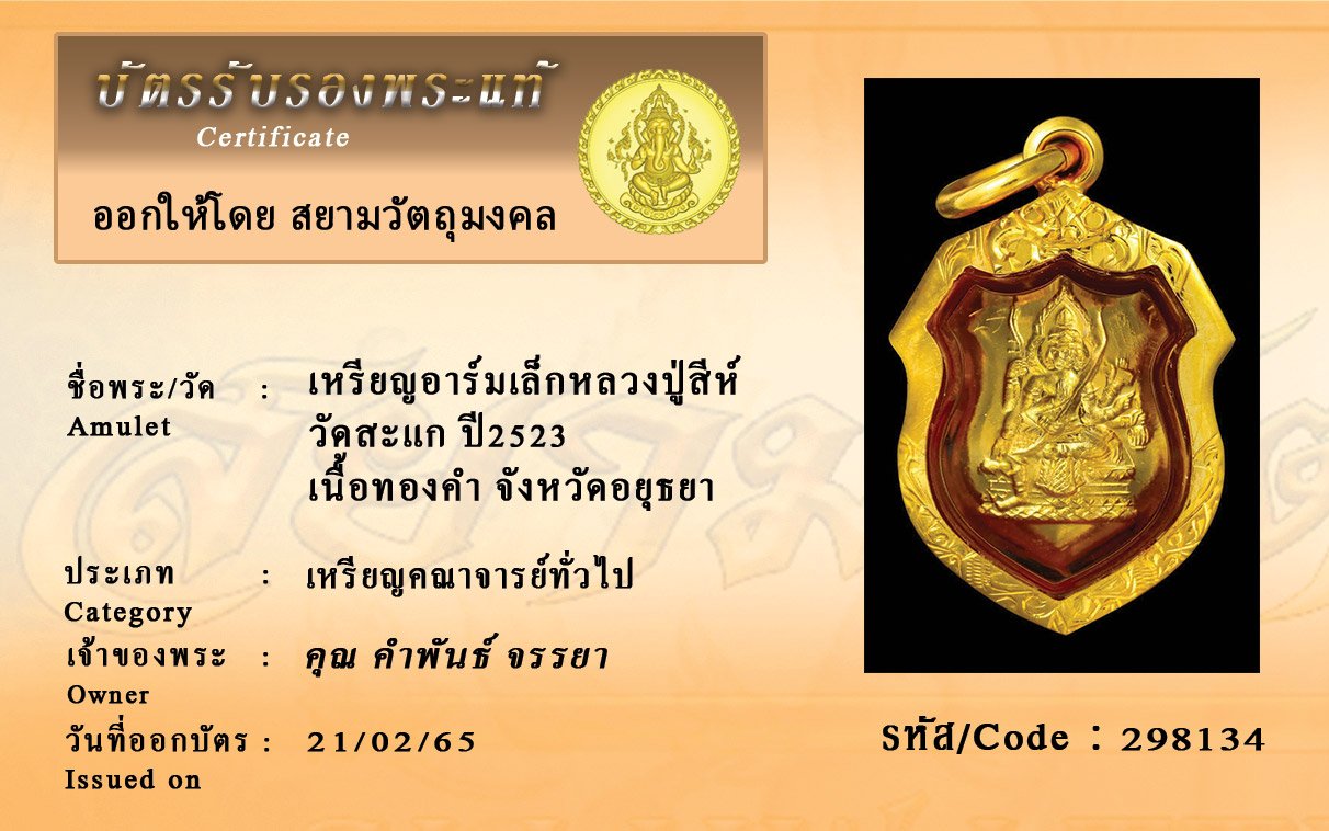 รหัสสินค้า : 298134 เหรียญอาร์มเล็กหลวงปู่สีห์ วัดสะแก ปี2523 เนื้อทองคำ จังหวัดอยุธยา