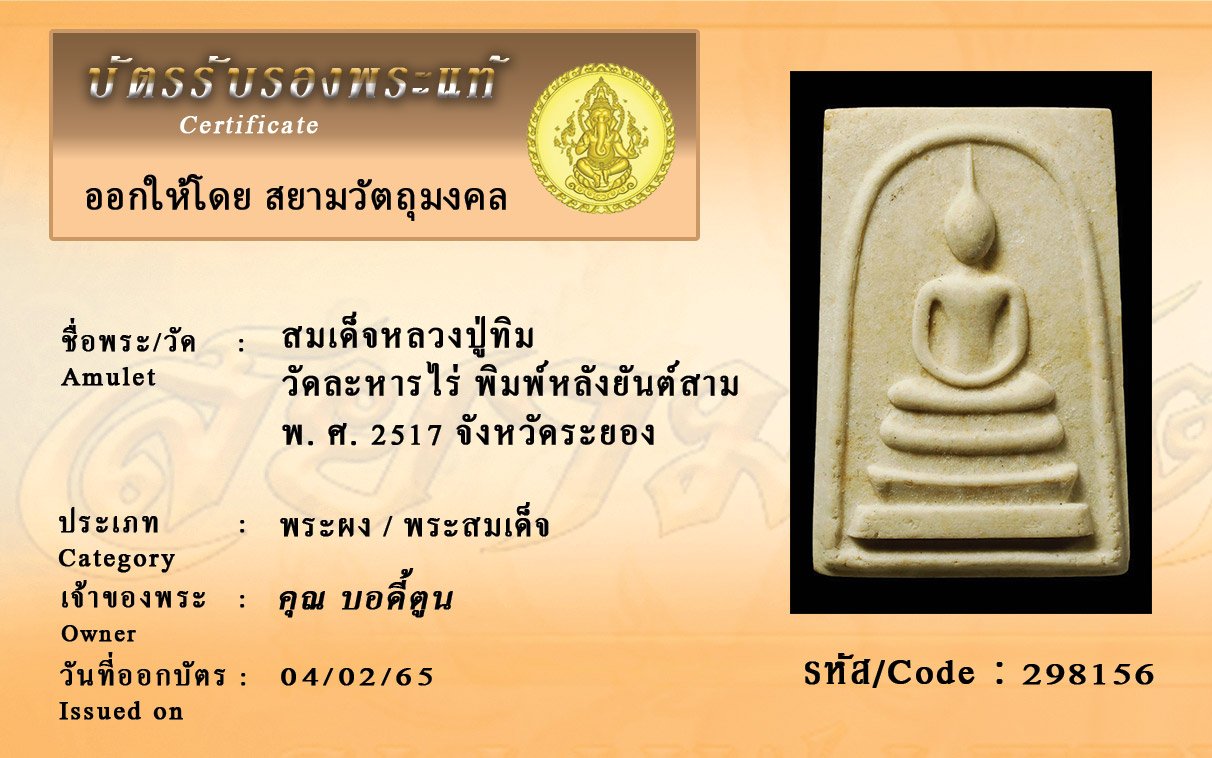 รหัสสินค้า : 298156 สมเด็จหลวงปู่ทิม วัดละหารไร่ พิมพ์หลังยันต์สาม พ. ศ. 2517 จังหวัดระยอง