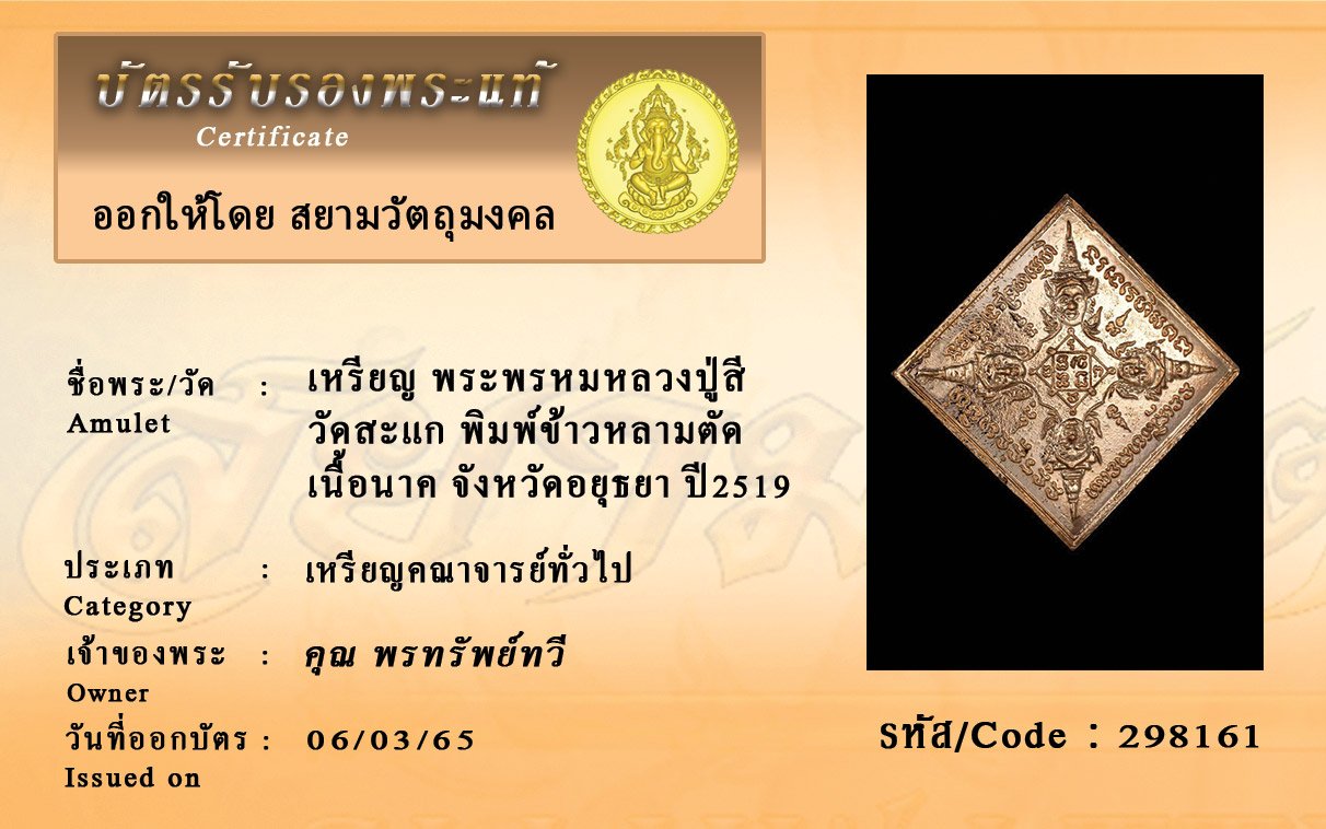 รหัสสินค้า : 298161 เหรียญ พระพรหมหลวงปู่สี วัดสะแก พิมพ์ข้าวหลามตัด เนื้อนาค จังหวัดอยุธยา ปี2519