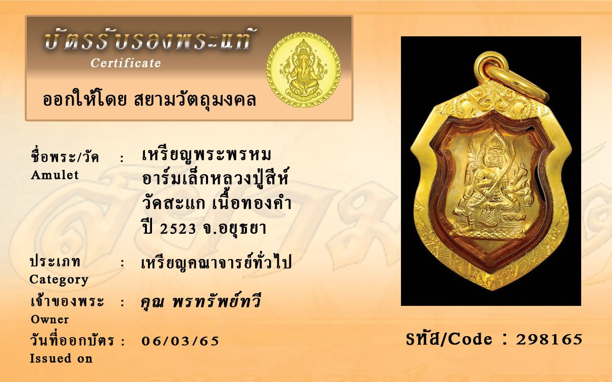 รหัสสินค้า : 298165 เหรียญพระพรหม อาร์มเล็กหลวงปู่สีห์ วัดสะแก เนื้อทองคำ ปี 2523 จ.อยุธยา