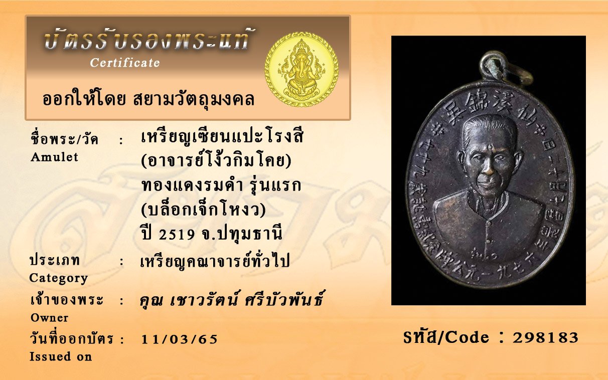 รหัสสินค้า : 298183 เหรียญเซียนแปะโรงสี (อาจารย์โง้วกิมโคย) ทองแดงรมดำ รุ่นแรก (บล็อกเจ็กโหงว) ปี 2519 จ.ปทุมธานี