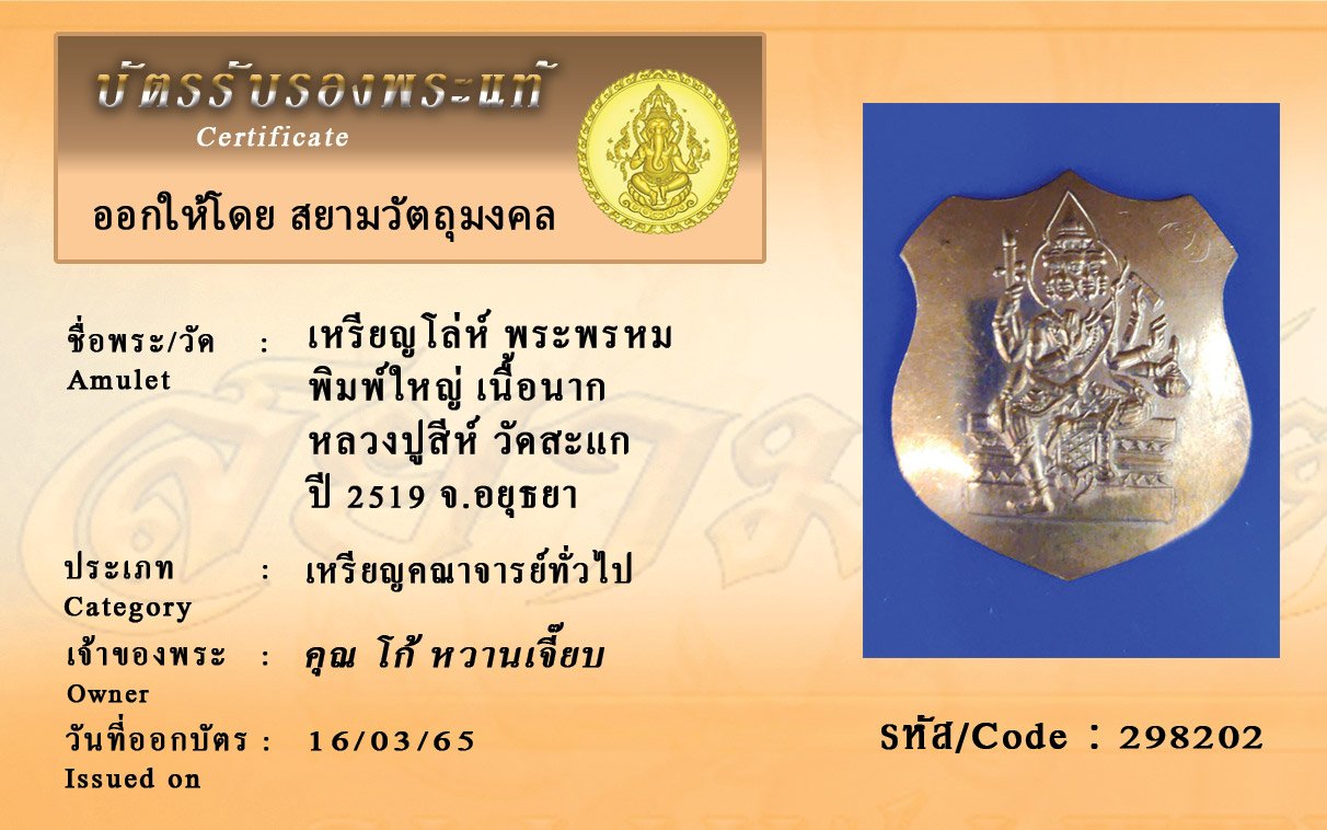 รหัสสินค้า : 298202 เหรียญโล่ห์ พระพรหม พิมพ์ใหญ่ เนื้อนาก หลวงปูสีห์ วัดสะแก ปี 2519 จ.อยุธยา