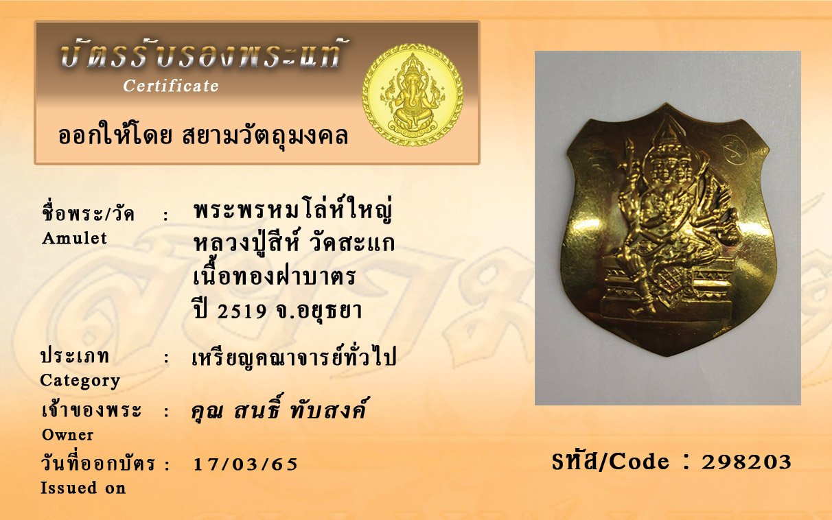 รหัสสินค้า : 298203 พระพรหมโล่ห์ใหญ่ หลวงปู่สีห์ วัดสะแก เนื้อทองฝาบาตร ปี 2519 จ.อยุธยา