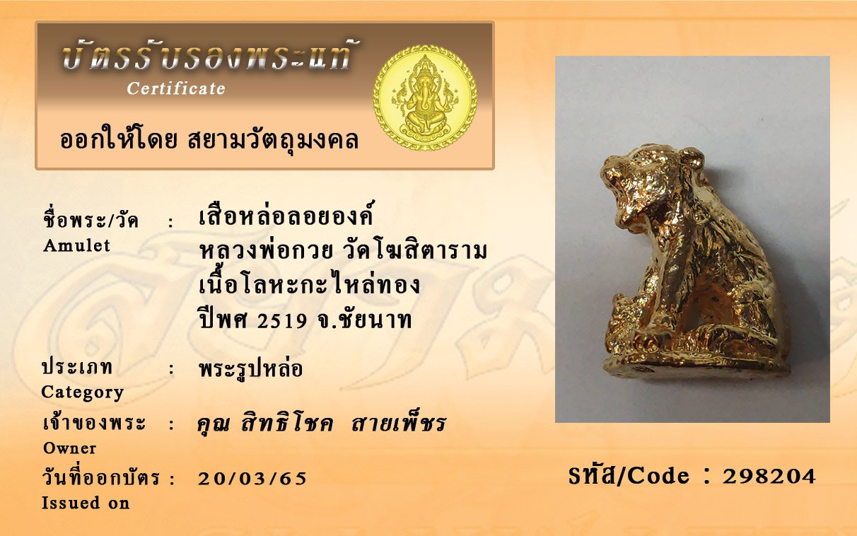 รหัสสินค้า : 298204 เสือหล่อลอยองค์ หลวงพ่อกวย วัดโฆสิตาราม เนื้อโลหะกะไหล่ทอง ปีพศ 2519 จ.ชัยนาท