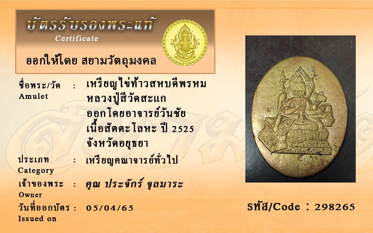 รหัสสินค้า : 298265 เหรียญไข่ท้าวสหบดีพรหม หลวงปู่สีวัดสะแก ออกโดยอาจารย์วันชัย เนื้อสัตตะโลหะ ปี 2525 จังหวัดอยุธยา