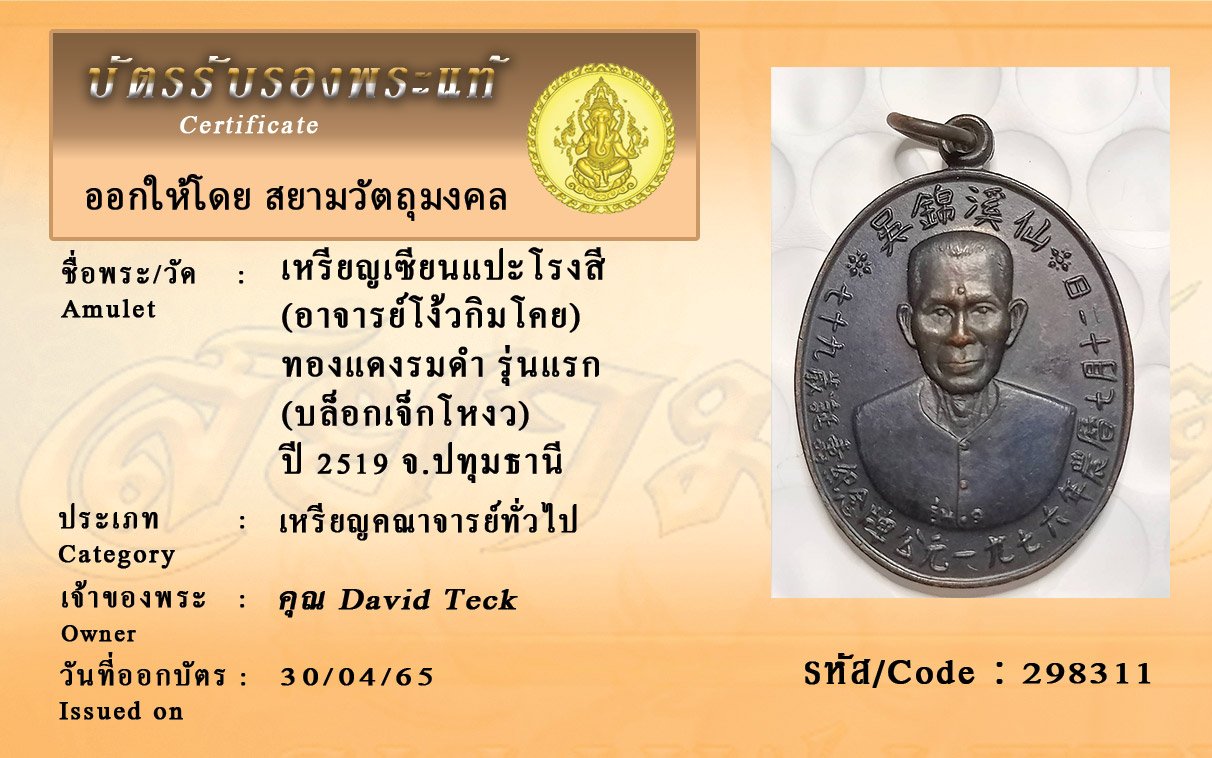 รหัสสินค้า : 298311 เหรียญเซียนแปะโรงสี (อาจารย์โง้วกิมโคย) ทองแดงรมดำ รุ่นแรก (บล็อกเจ็กโหงว) ปี 2519 จ.ปทุมธานี