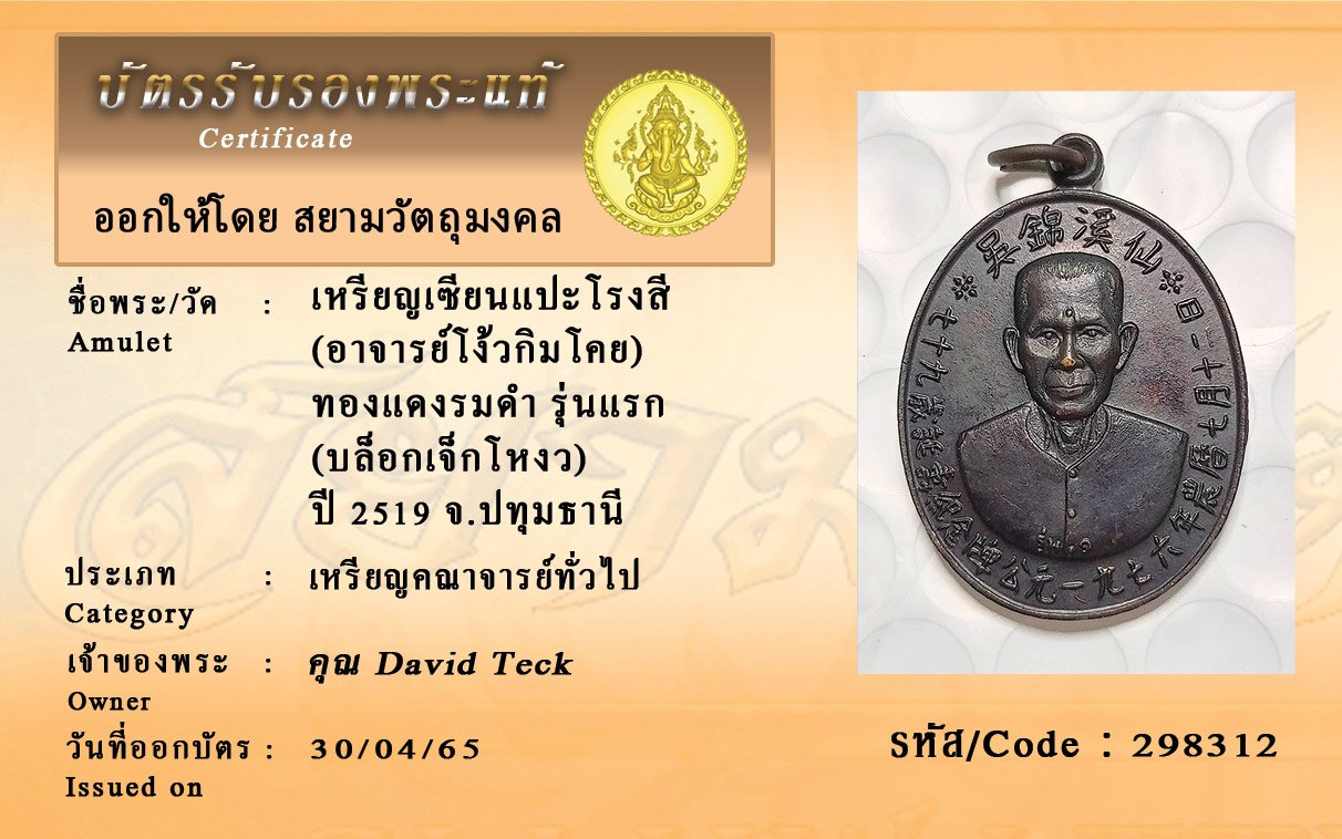 รหัสสินค้า : 298312 เหรียญเซียนแปะโรงสี (อาจารย์โง้วกิมโคย) ทองแดงรมดำ รุ่นแรก (บล็อกเจ็กโหงว) ปี 2519 จ.ปทุมธานี
