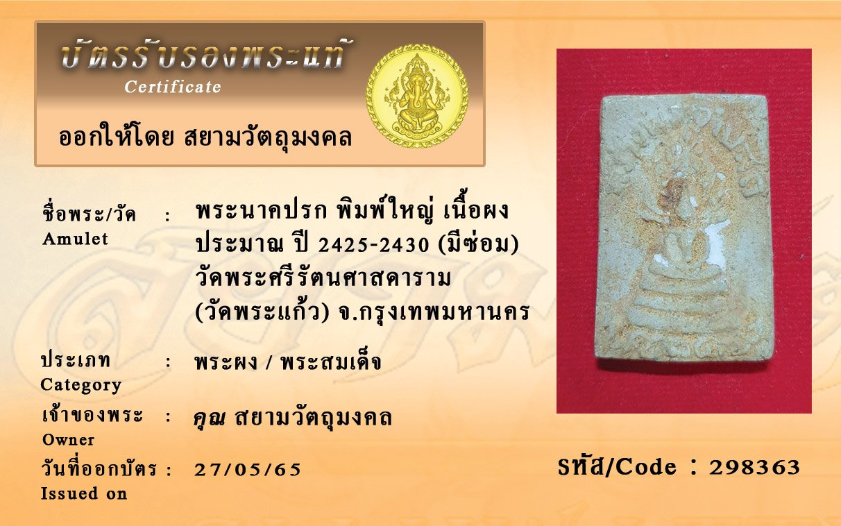 รหัสสินค้า : 298363 พระนาคปรก พิมพ์ใหญ่ เนื้อผง ประมาณ ปี 2425-2430 (มีซ่อม) วัดพระศรีรัตนศาสดาราม (วัดพระแก้ว) จ.กรุงเทพมหานคร