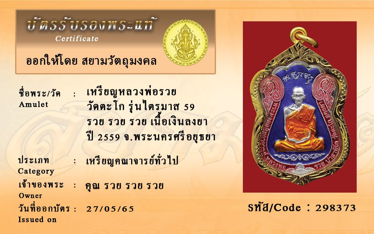 รหัสสินค้า : 298373 เหรียญหลวงพ่อรวย วัดตะโก รุ่นไตรมาส 59 รวย รวย รวย เนื้อเงินลงยา ปี 2559 จ.พระนครศรีอยุธยา