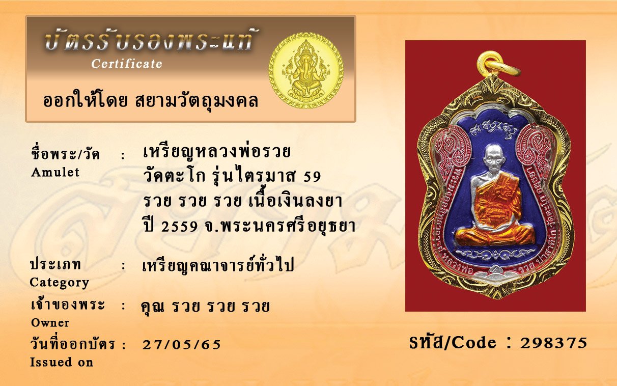 รหัสสินค้า : 298375 เหรียญหลวงพ่อรวย วัดตะโก รุ่นไตรมาส 59 รวย รวย รวย เนื้อเงินลงยา ปี 2559 จ.พระนครศรีอยุธยา