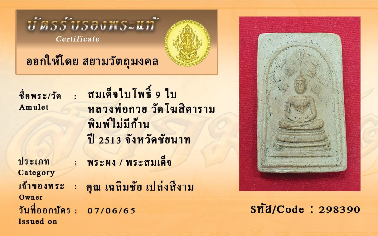 รหัสสินค้า : 298390 สมเด็จใบโพธิ์ 9 ใบ หลวงพ่อกวย วัดโฆสิตาราม พิมพ์ไม่มีก้าน ปี 2513 จังหวัดชัยนาท