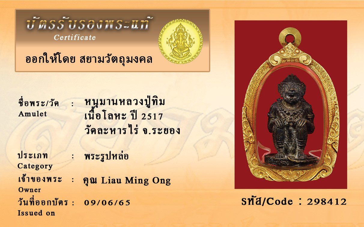 รหัสสินค้า : 298412 หนุมานหลวงปู่ทิม เนื้อโลหะ ปี 2517 วัดละหารไร่ จ.ระยอง