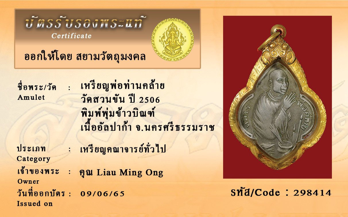 รหัสสินค้า : 298414 เหรียญพ่อท่านคล้าย วัดสวนขัน ปี 2506 พิมพ์พุ่มข้าวบิณฑ์ เนื้ออัลปาก้า จ.นครศรีธรรมราช
