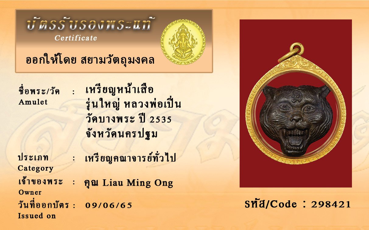 รหัสสินค้า : 298421 เหรียญหน้าเสือ รุ่นใหญ่ หลวงพ่อเปิ่น วัดบางพระ ปี 2535 จังหวัดนครปฐม