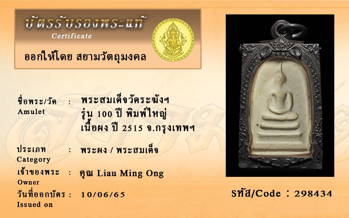 รหัสสินค้า : 298434 พระสมเด็จวัดระฆังฯ รุ่น 100 ปี พิมพ์ใหญ่ เนื้อผง ปี 2515 จ.กรุงเทพฯ