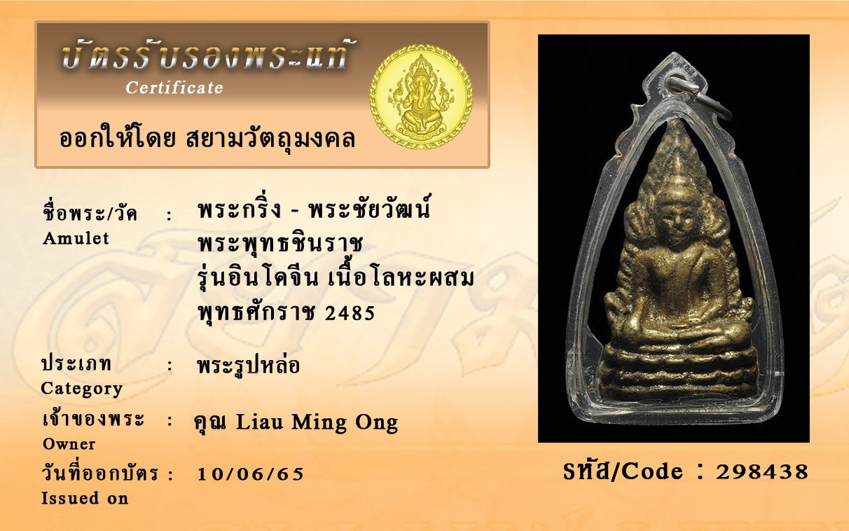 รหัสสินค้า : 298438 พระกริ่ง - พระชัยวัฒน์ พระพุทธชินราช รุ่นอินโดจีน เนื้อโลหะผสม พุทธศักราช 2485