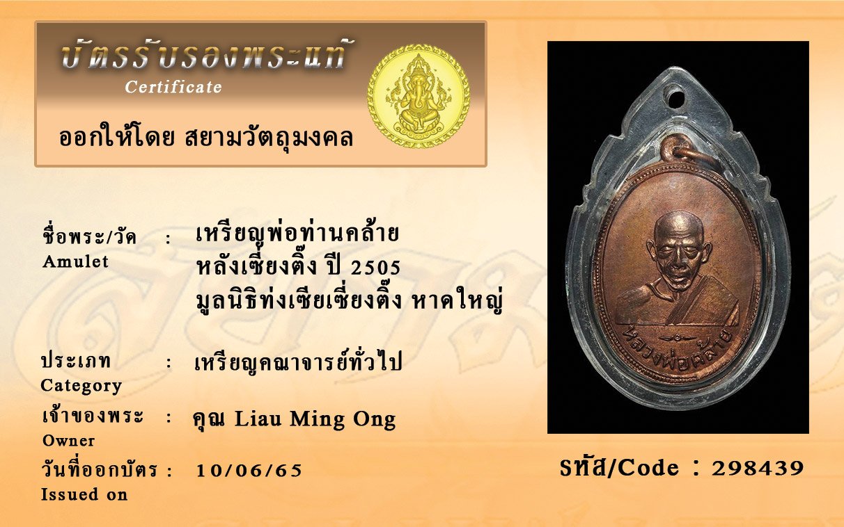 รหัสสินค้า : 298439 เหรียญพ่อท่านคล้าย หลังเซี่ยงติ๊ง ปี 2505 มูลนิธิท่งเซียเซี่ยงติ๊ง หาดใหญ่