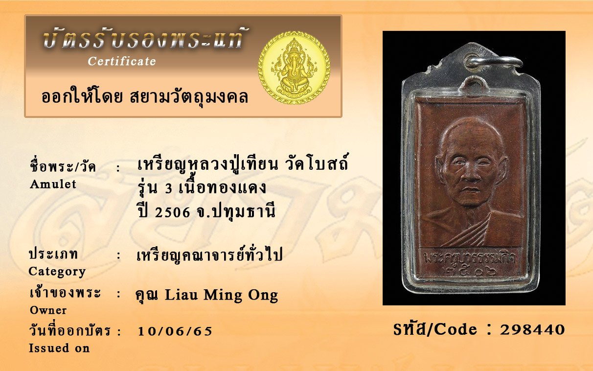 รหัสสินค้า : 298440 เหรียญหลวงปู่เทียน วัดโบสถ์ รุ่น 3 เนื้อทองแดง ปี 2506 จ.ปทุมธานี