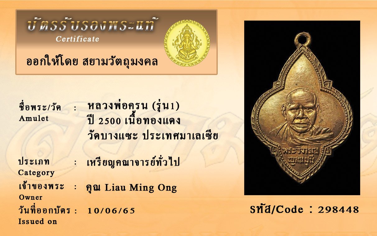 รหัสสินค้า : 298448 หลวงพ่อครน (รุ่น1) ปี 2500 เนื้อทองแดง วัดบางแซะ ประเทศมาเลเซีย