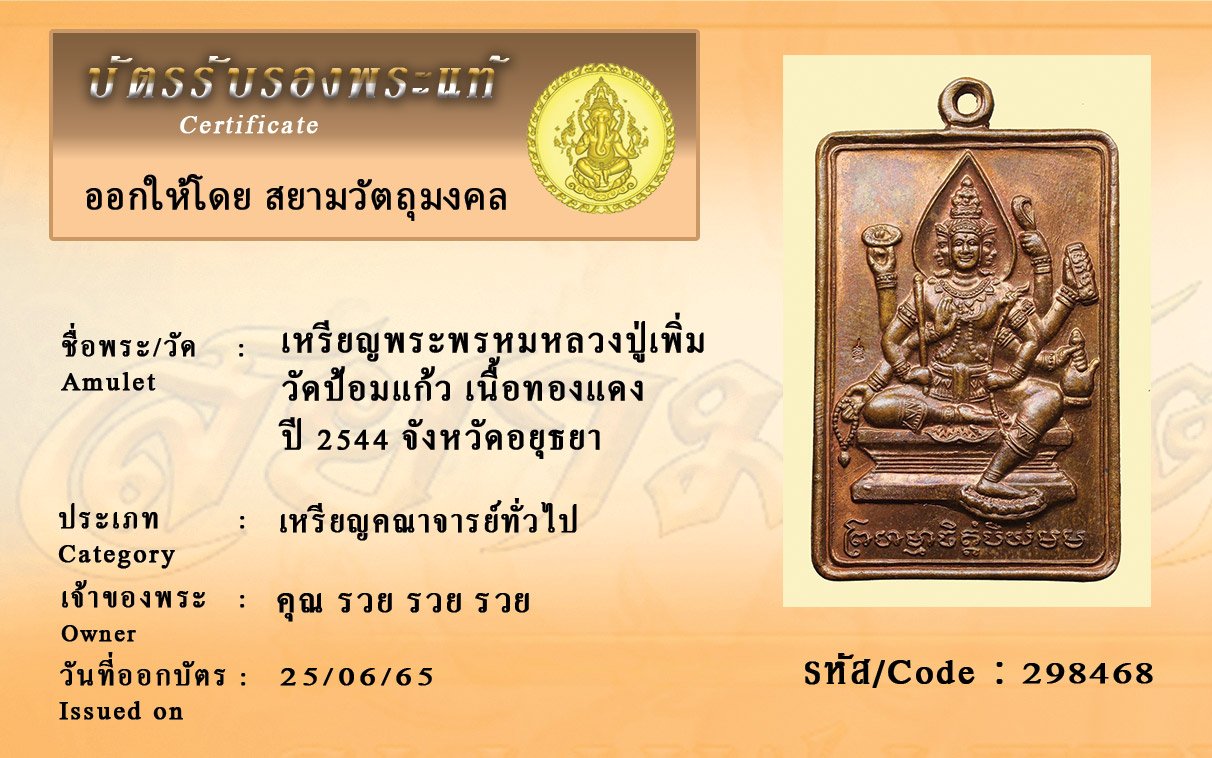 รหัสสินค้า : 298468 เหรียญพระพรหมหลวงปู่เพิ่ม วัดป้อมแก้ว เนื้อทองแดง ปี 2544 จังหวัดอยุธยา