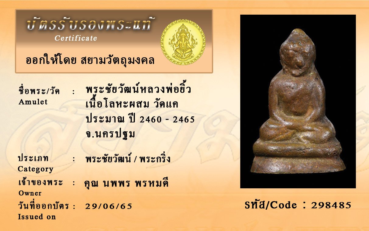 รหัสสินค้า : 298485 พระชัยวัฒน์หลวงพ่อยิ้ว เนื้อโลหะผสม วัดแค ประมาณ ปี 2460 - 2465 จ.นครปฐม