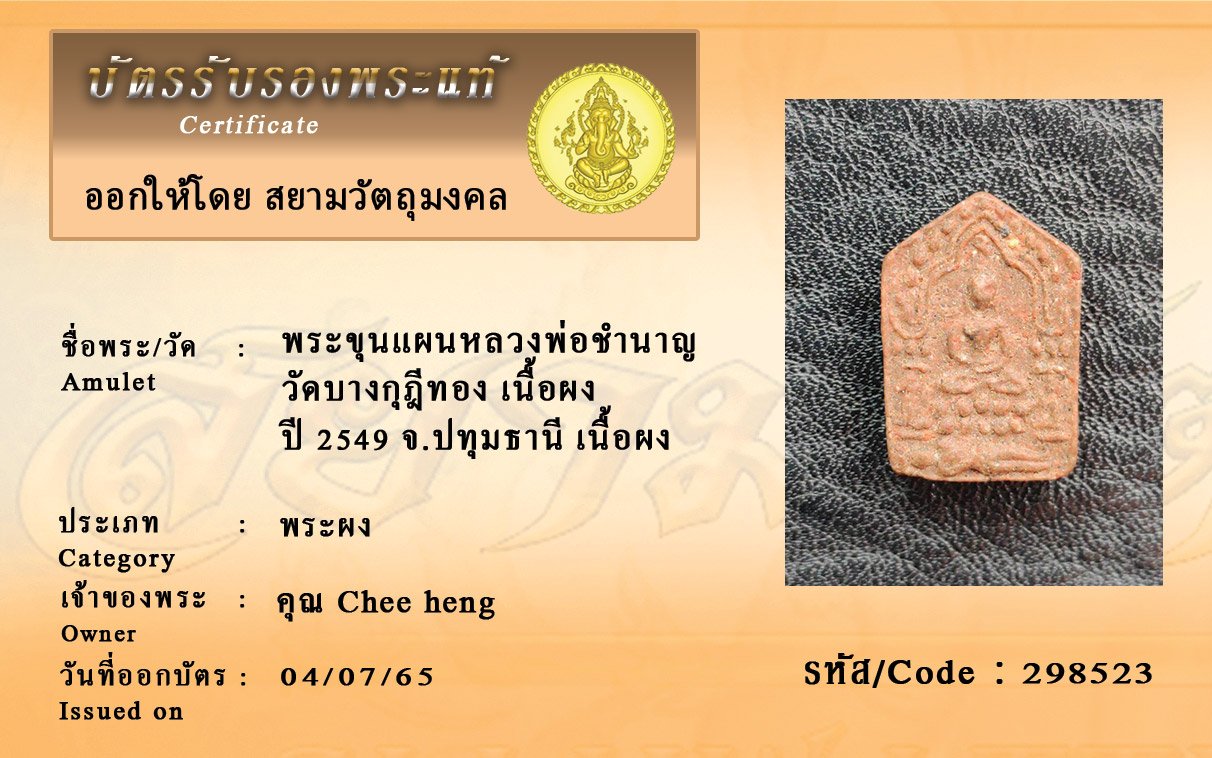 รหัสสินค้า : 298523 พระขุนแผนหลวงพ่อชำนาญ วัดบางกุฎีทอง เนื้อผง ปี 2549 จ.ปทุมธานี เนื้อผง