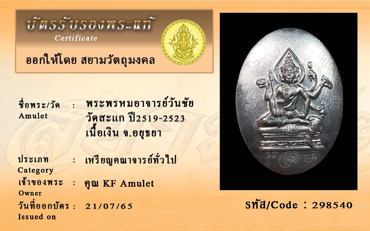 รหัสสินค้า : 298540 พระพรหมอาจารย์วันชัย วัดสะเเก ปี2519-2523 เนื้อเงิน จ.อยุธยา