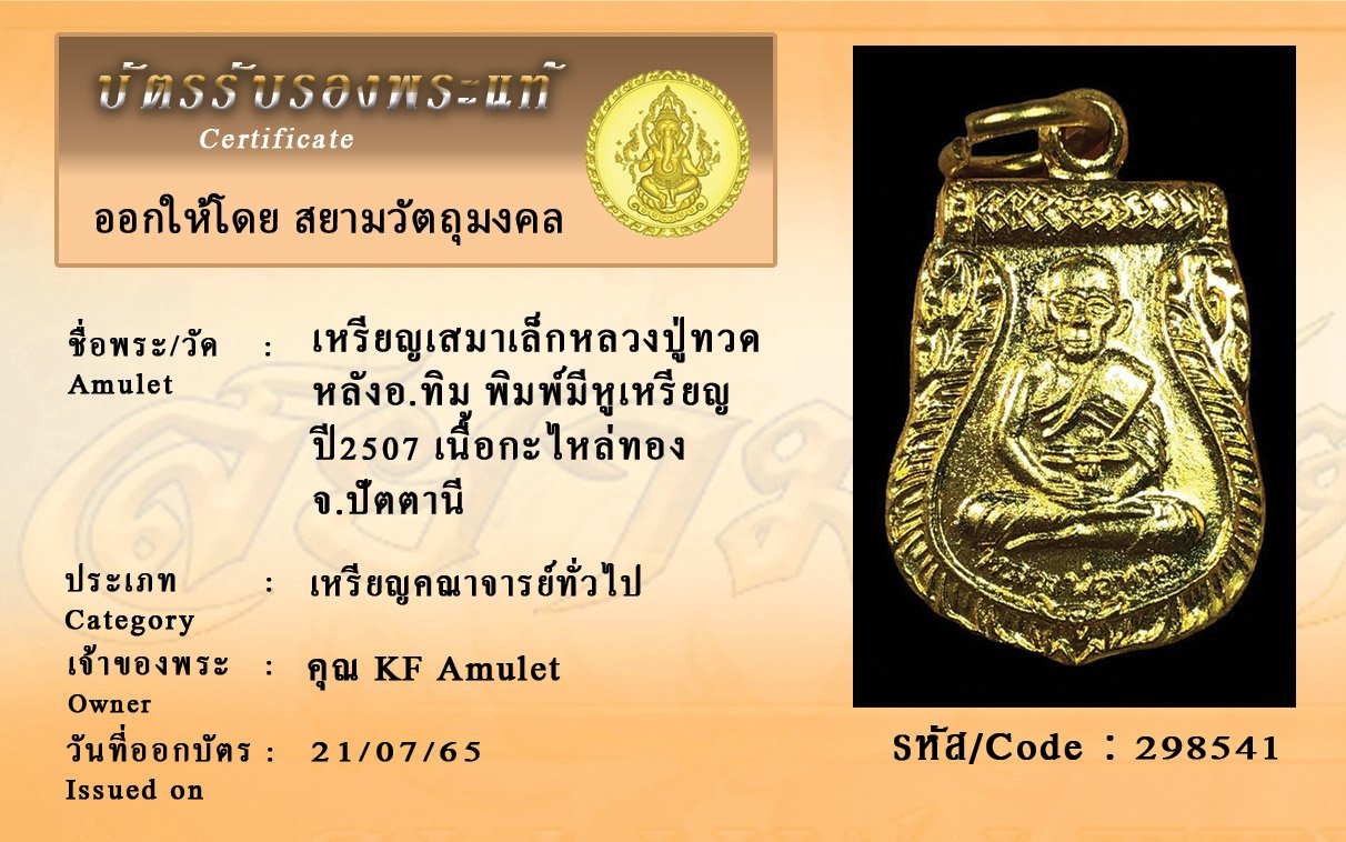 รหัสสินค้า : 298541 เหรียญเสมาเล็กหลวงปู่ทวด หลังอ.ทิม พิมพ์มีหูเหรียญ ปี2507 เนื้อกะไหล่ทอง จ.ปัตตานี