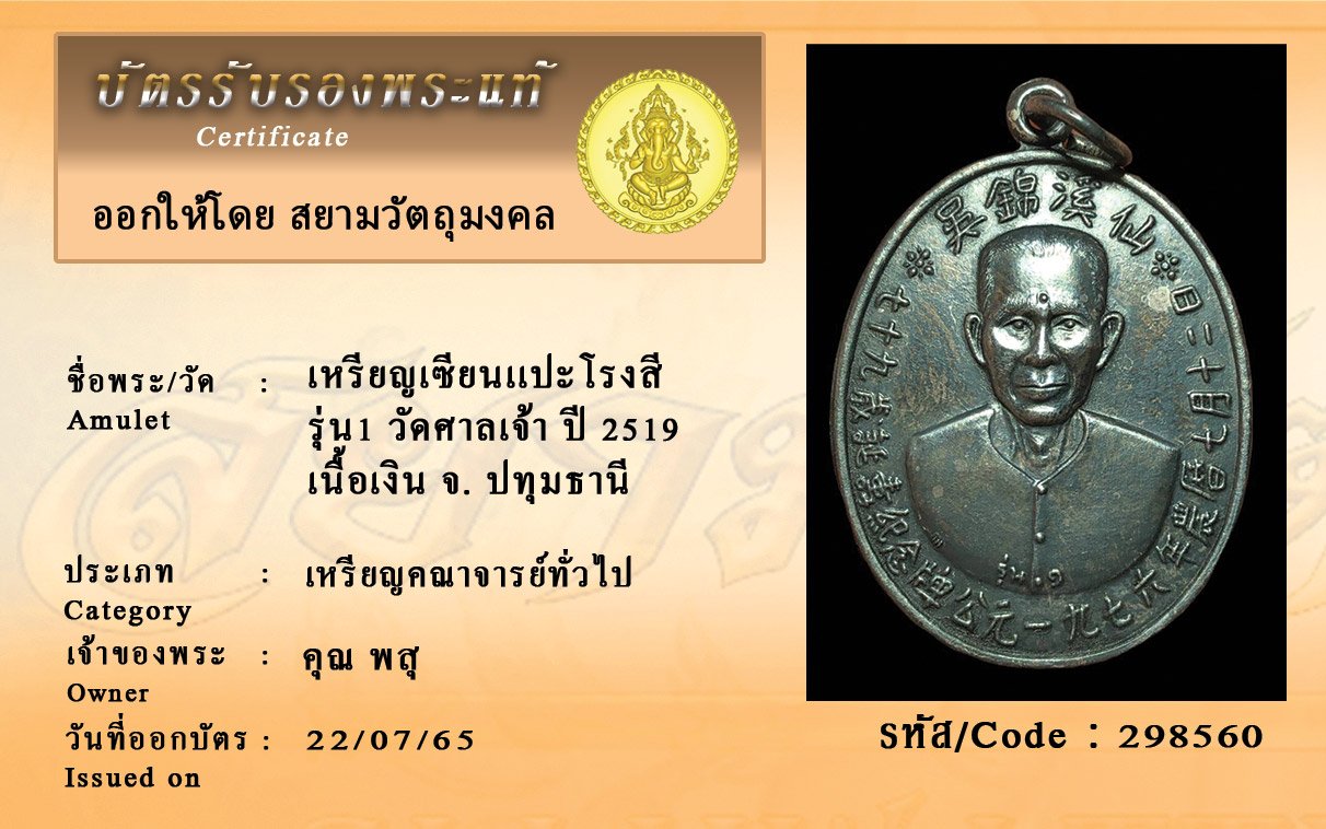 รหัสสินค้า : 298560 เหรียญเซียนเเปะโรงสี รุ่น1 วัดศาลเจ้า ปี2519 เนื้อเงิน จ. ปทุมธานี ประเภท เหรียญคณาจารย์ท่ัวไป