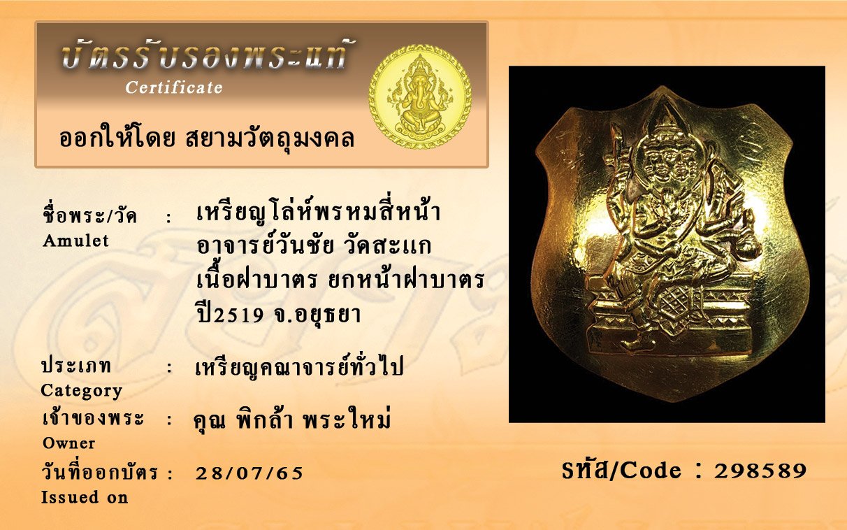 รหัสสินค้า : 298589 เหรียญโล่ห์พรหมสี่หน้า อาจารย์วันชัย วัดสะเเก เนื้อฝาบาตร ยกหน้าฝาบาตร ปี2519 จ.อยุธยา