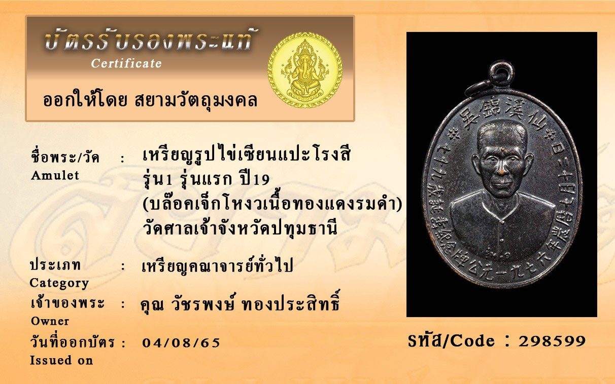 รหัสสินค้า : 298599 เหรียญรูปไข่เซียนแปะโรงสี รุ่น1 รุ่นแรก ปี19 (บล๊อคเจ็กโหงวเนื้อทองแดงรมดำ) วัดศาลเจ้าจังหวัดปทุมธานี